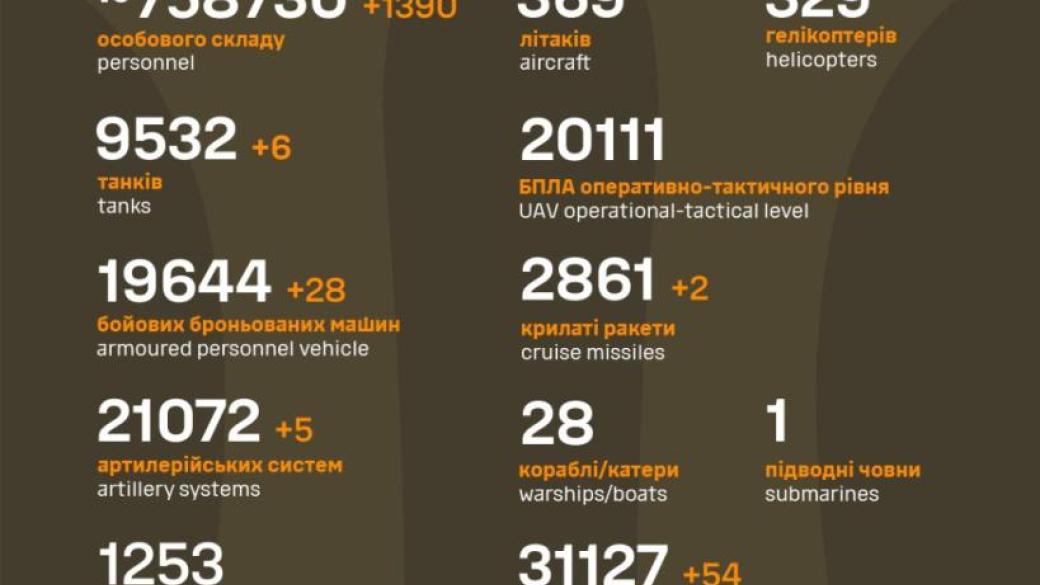 За прошедшие сутки Силы обороны ликвидировали 1390 оккупантов и десятки единиц вражеской техники.