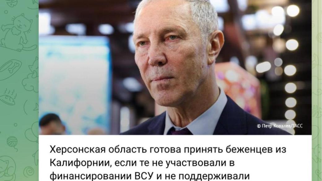 Оккупированная часть Херсонской области Украины готова принять беженцев из Калифорнии (США), пострадавших от масштабного пожара с 8 января. Об этом пропагандистскому изданию ТАСС заявил гауляйтер Херсонской области Владимир Сальдо.