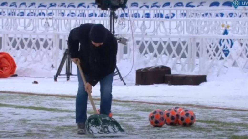 За несколько минут до начала игры «Мистер» взял лопату и попытался счистить снег с газона. Однако у румынского коуча «бело-синих» это не очень хорошо получилось, и в итоге он отдал инструмент своему помощнику.