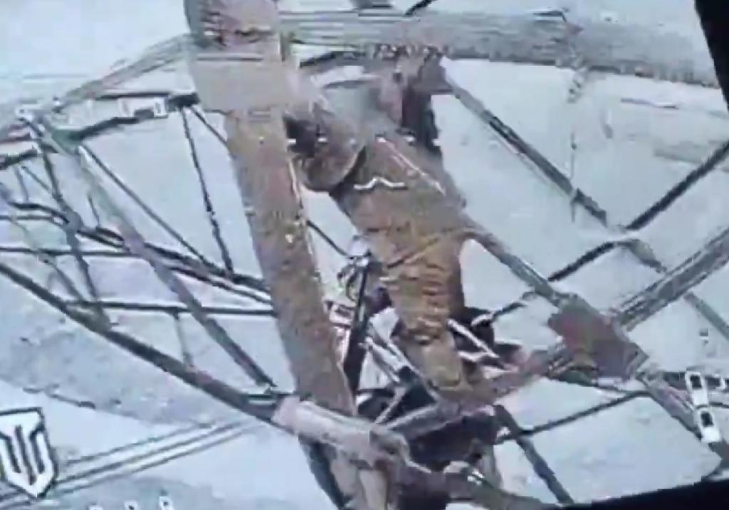 На опубликованных кадрах видно российского оператора полевой связи, который поднимается на опору линии электропередач для установки ретранслятора и антенн. В этот момент его поражает FPV-дрон.
