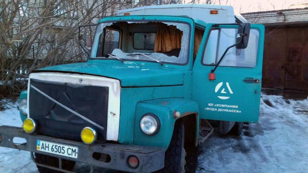 Коммунальное предприятие «Компания „Ввода Донбасса“» опубликовала снимки попавшей под обстрел сегодня служебной машины.
