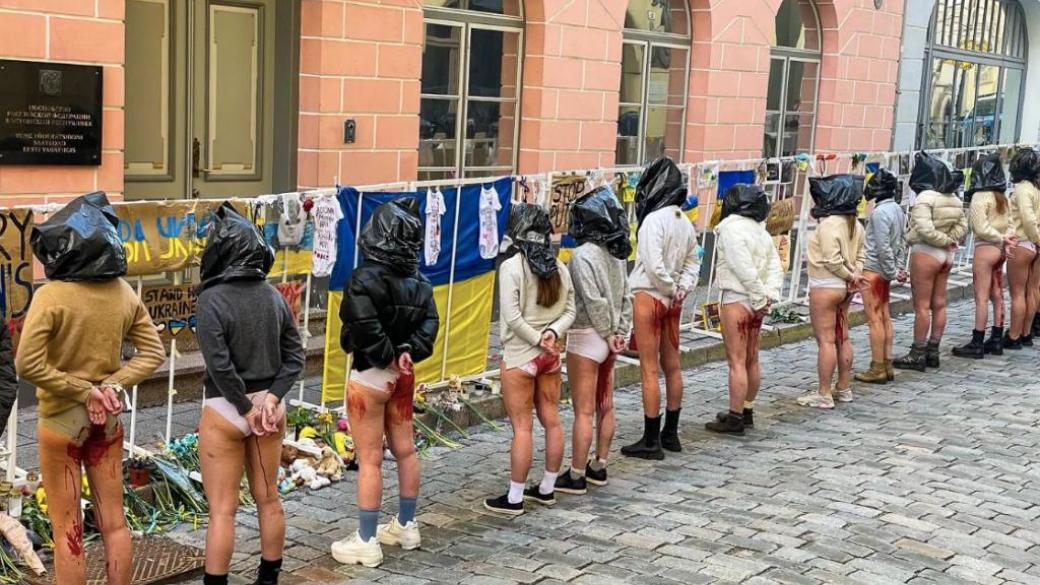 Женщины третий день выходят с протестом к посольству России в Эстонии, сообщает эстонское телевидение ERR. На девушках надето нижнее белье, залитое краской, имитирующей кровь, и пластиковые мешки на головах.