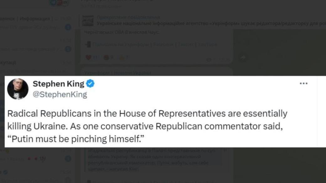 Культовый американский писатель, король ужасов Стивен Кинг, активно поддерживающий Украину, жестко прокомментировал. задержку и постоянную отсрочку республиканцами голосования по военной помощи Украины.