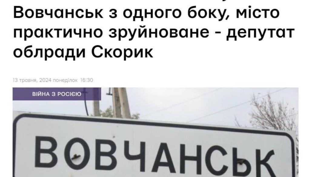 Войска рф начинают окружать Волчанск Харьковской области с одной стороны. Об этом заявил депутат Харьковского облсовета Скорик.