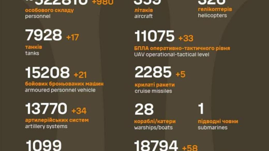 За минувшие сутки Силам обороны удалось ликвидировали 980 захватчиков.