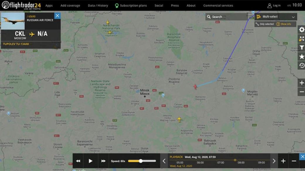 По свидетельству данных портала FlightRadar, самолет вылетел с военного аэродрома Чкаловский в Московской области ночью в среду, 12 августа, и приземлился в районе населенного пункта Замок (Минская область).