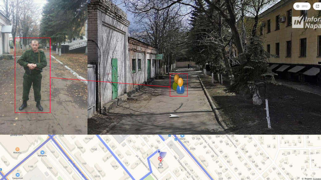 Волонтеры выяснили, что он стоит возле здания по адресу г. Донецк, переулок Покрышева, 23. Кроме того, Синявский сфотографировался неподалеку, на территории военизированной горно-спасательной части, адрес: Донецк, улица Николенко, 7, где фиксировалось присутствие не менее 4 подразделений ВС РФ: 18-й ОМСБр (1, 2), 66-й бригады связи, 33-й ОМСБр и, как свидетельствуют новые доказательства, 34-й ОМСБр горной.
