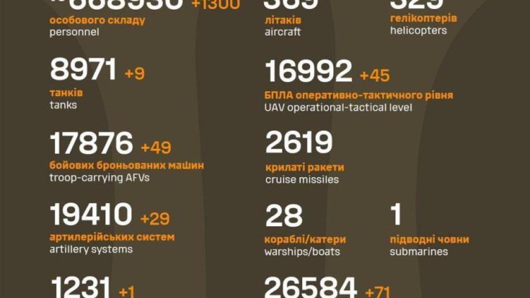 За прошедшие сутки ВСУ ликвидировали 1300 оккупантов и более 200 единиц техники.