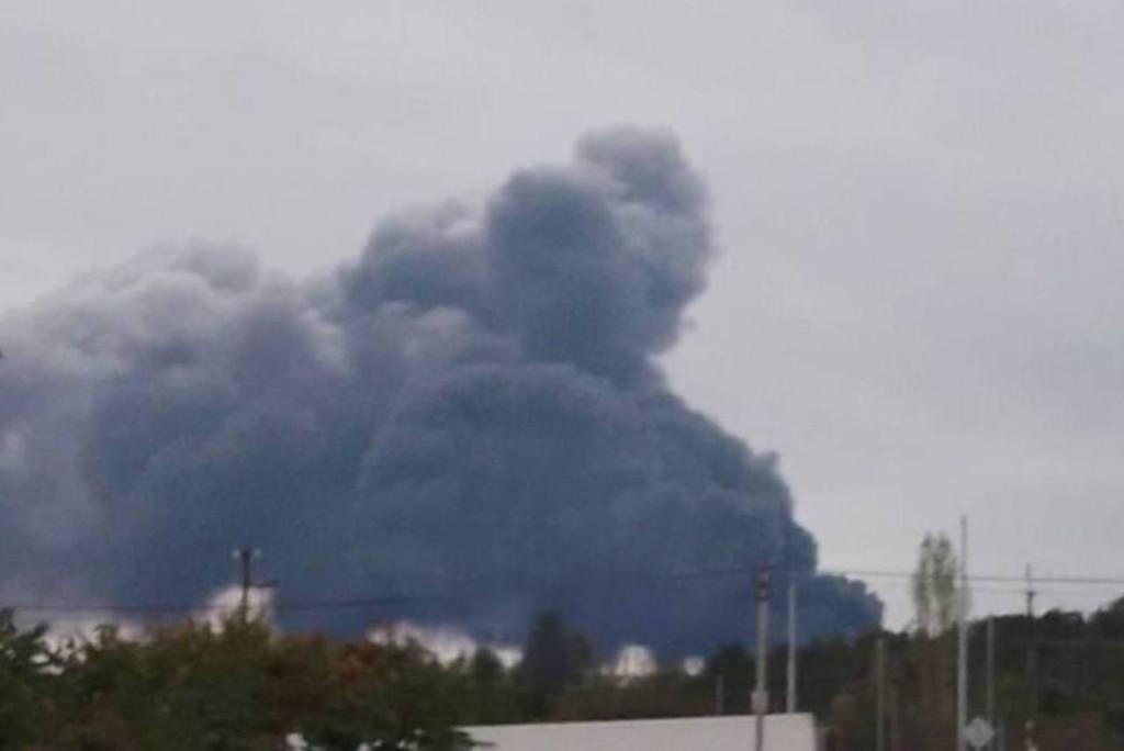 В результате удара, предположительно, вспыхнули по меньшей мере три резервуара с топливом, на нефтебазу выехало большое количество пожарных машин.
