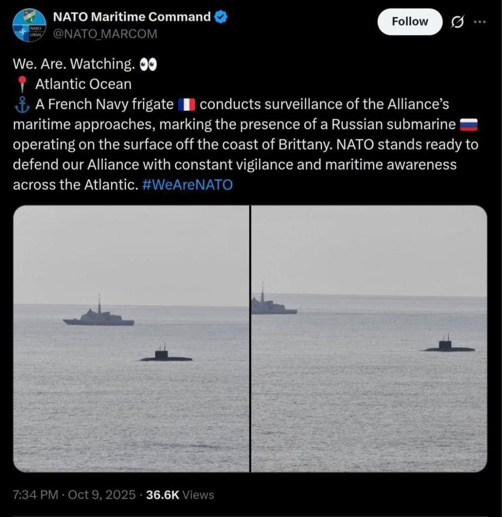 Фрегат французского флота следил за морскими подступами Альянса и отметил присутствие российской субмарины. НАТО подтвердило, что постоянно следит за ситуацией в Атлантике и готово защищать свои страны-члены.