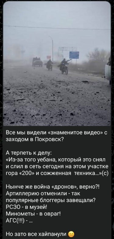 Ресурс цитирует Z-блогера «Разведоса» (Александра Арутюнова), который пожаловался на то, что ВСУ ударили по скоплению живой силы и техники в Покровске после завирусившегося видео: