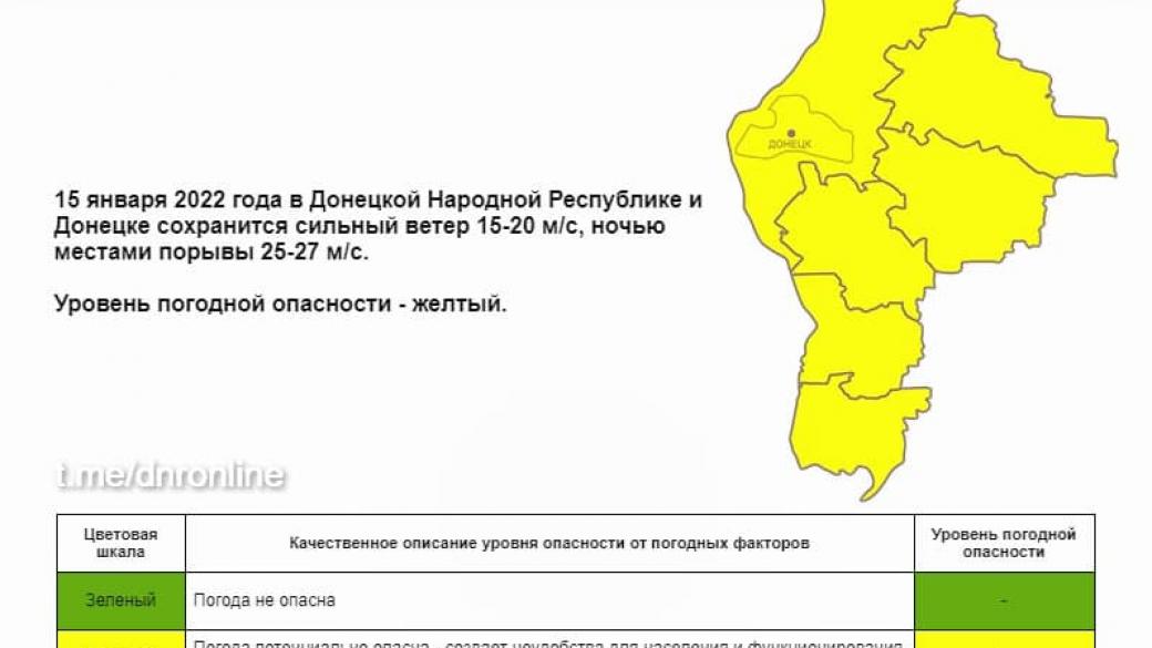На неподконтрольной Украине части Донетчины на 15 января объявлено штормовое предупреждение. Об этом сообщает так называемое «МЧС ДНР».