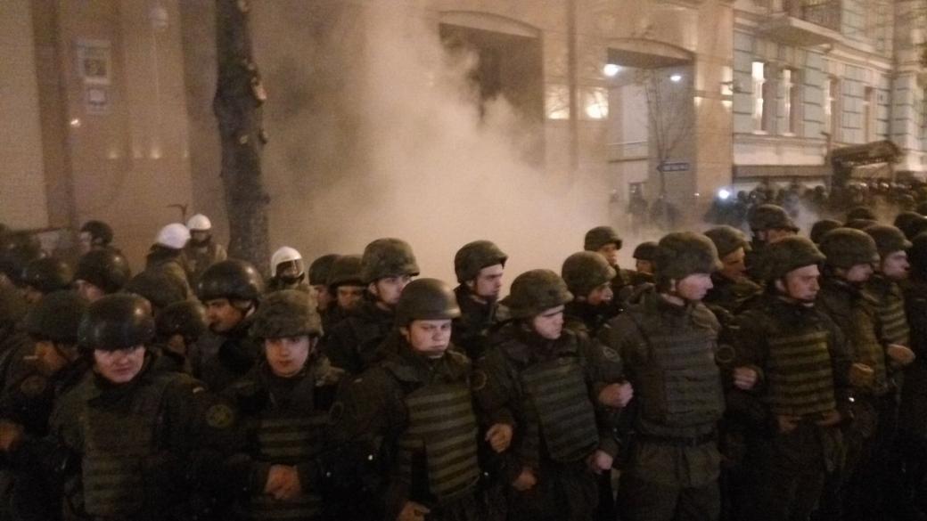Журналист Максим Кудимець на своей странице в соцсети написал: «Под Альфа-Банком столкновения митингующих с Нацгвардейцами. В ход пошел слезоточивый газ».
