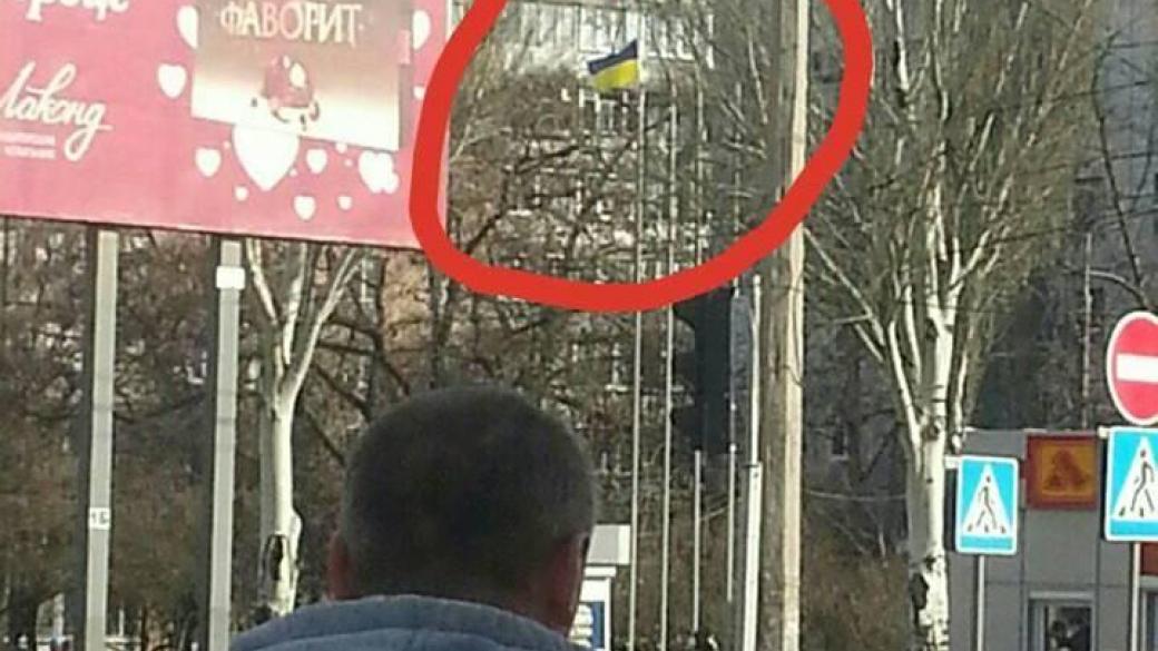 Появившийся сегодня, 14 марта, флаг Украины в неподконтрольном украинскому правительству Донецке снимали при помощи саперов. Об этом сообщают очевидцы в социальных сетях.