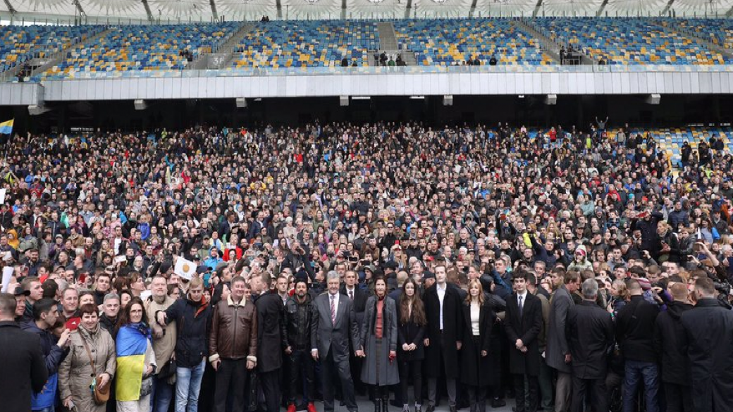 На НСК «Олимпийском» 14 апреля, Петр Порошенко сделал совместное селфи со своими сторонниками на НСК «Олимпийский» и спел гимн Украины.