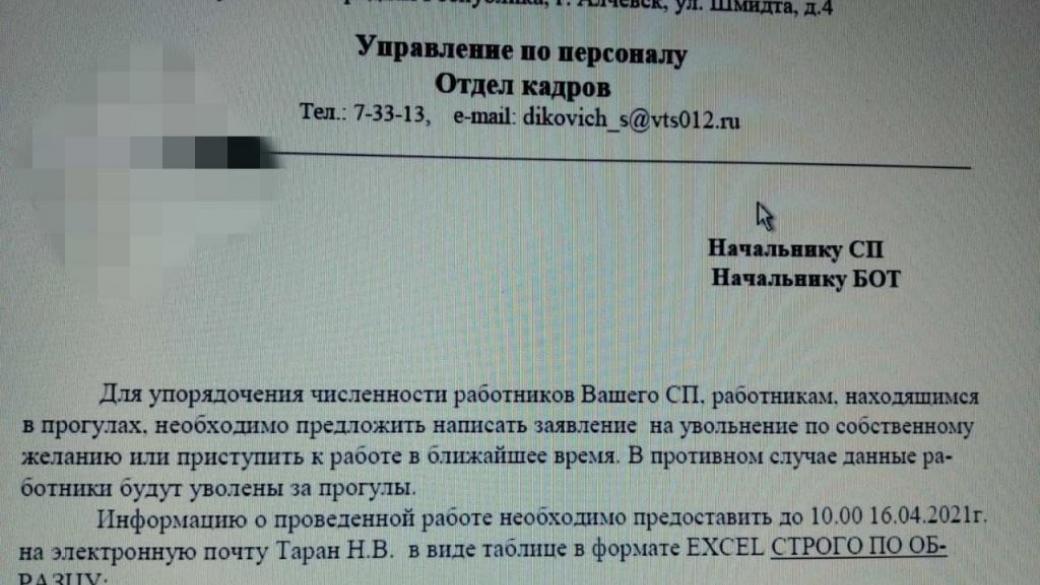 «Задача поставлена главным инженером Максимом Мокрицким и реализована начальником отдела кадров в виде письма на начальников подразделений. Выплатят ли в день расчета „прогульщикам“ все долги? В этом есть большие сомнения».