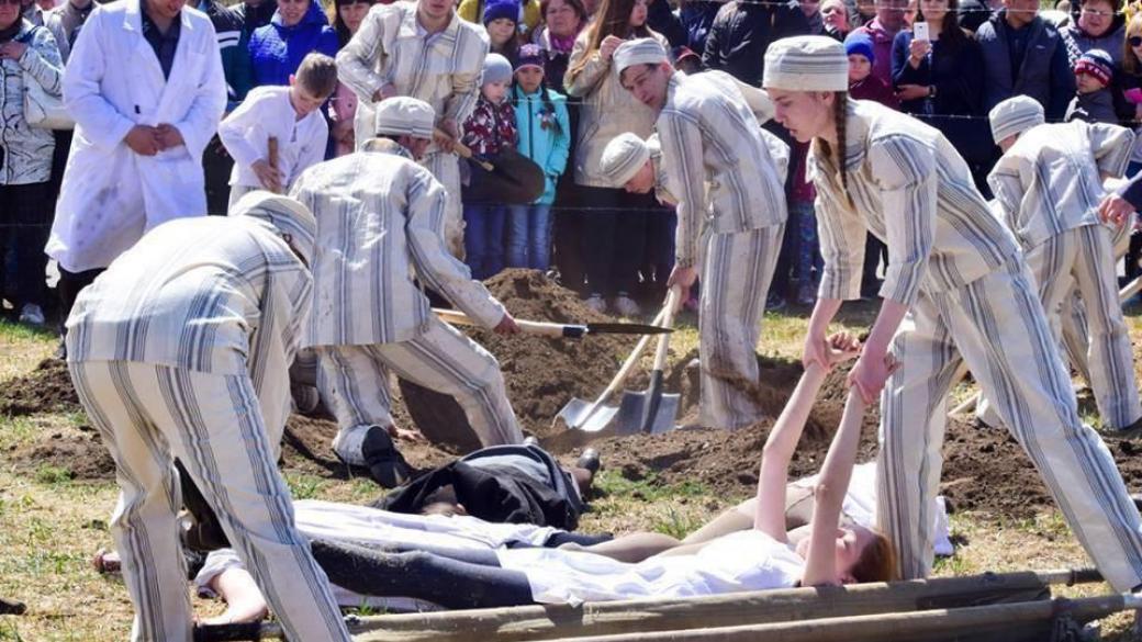 В российской Чите накануне 9 Мая жителям города представили театрализованную постановку, целью которой являлось воссоздать ужасы и пытки, которые приходилось переживать узникам нацистских концлагерей. Об этом на своей странице в Фейсбук сообщил российский журналист Аркадий Бабченко.