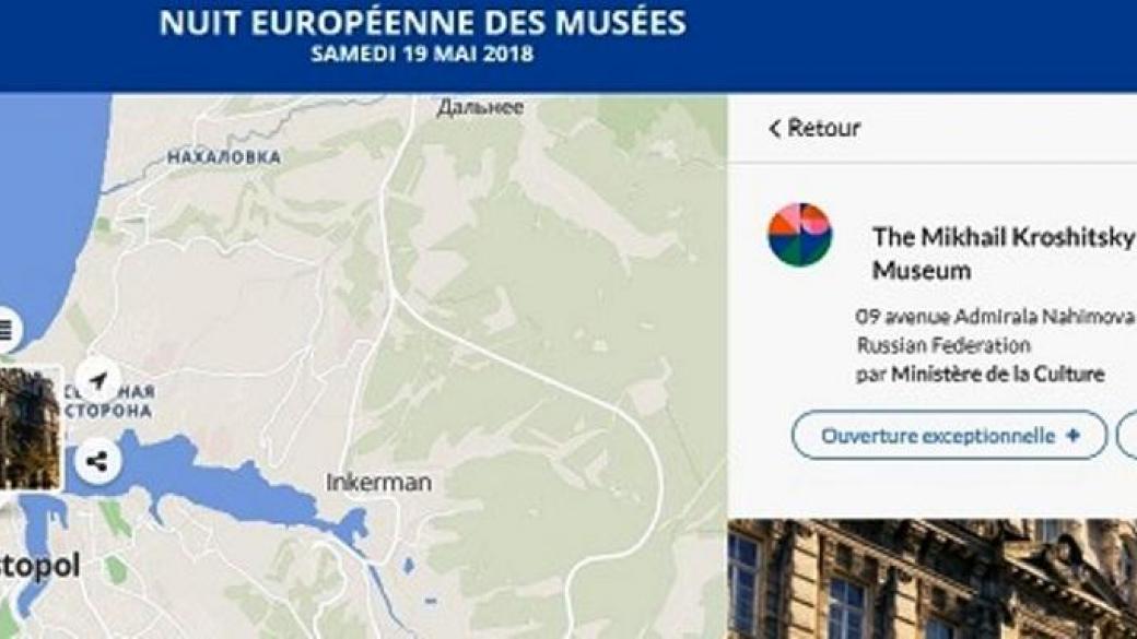 Так, на ресурсе французского ведомства опубликована карта с указанием участников международной акции «Ночь музеев-2018», где Севастопольский художественный музей имени М.П. Крошицкого, который также заявлен участником акции, подписан как российский.