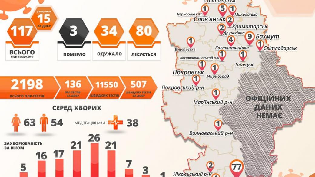 Четверо из новых выявленных инфицированных прибыли из России (два жители Славянска 34 и 61 лет; 45-летний житель Марьинского района и 40-летняя жительница Черкасской ОТГ). В Мариуполе среди выявленных инфицированных — 8 мужчин (83, 18, 58, 77, 49, 15, 25 и 56 лет) и 3 женщины (78, 72, 20 лет). В числе мариупольских больных есть один медик.