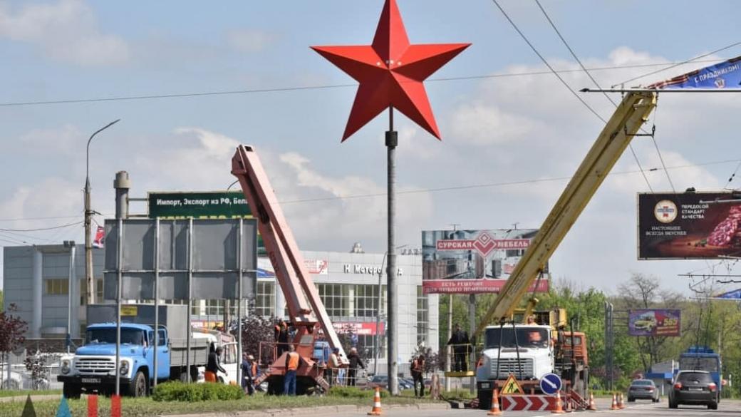 На въезде во временно неподконтрольный украинскому правительству Донецк появилась гигантская пятиконечная красная звезда, которую вчера, 13 мая, весь день устанавливали в районе «Мотеля». Об этом сообщают очевидцы в социальных сетях, отмечая, что внешне конструкция напоминает звезды на башнях московского Кремля.