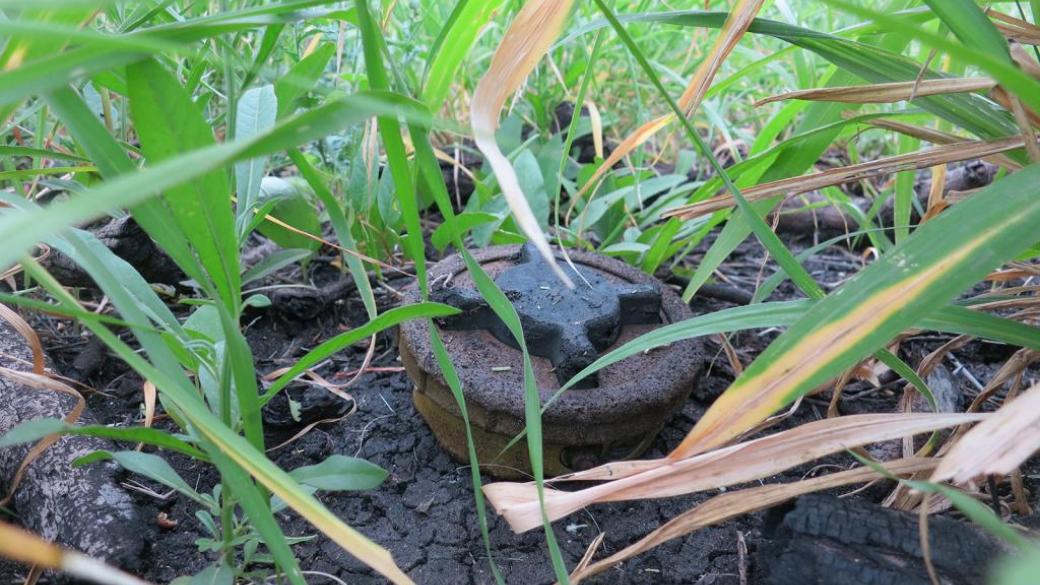 Справка штаба ООС: ПМН-2 — противопехотная фугасная мина нажимного действия. Поражение человеку наносится за счет разрушения нижней части ноги при взрыве заряда мины. Мина детонирует, когда человек наступает на датчик — черный крестообразный выступ на верхней плоскости ПМН.