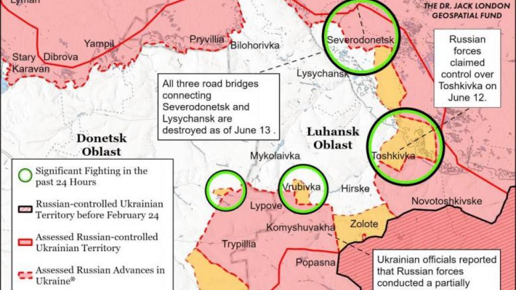По информации экспертов американского Института изучения войны (ISW), оккупанты вытеснили украинских защитников из центра Северодонецка, но полностью город не захватили.