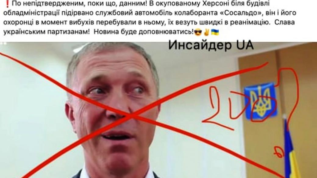 Экс-депутат и служащий ВСУ Андрей Немировский на своей странице в соцсети сообщил, что в захваченном военными РФ Херсоне возле здания обладминистрации взорван служебный автомобиль так называемого «главы» оккупационной администрации Херсонской области Владимира Сальдо.