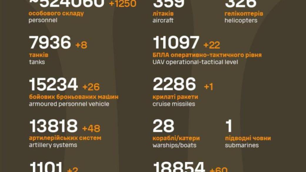 По сводке Генерального штаба ВСУ за прошедшие сутки Силы обороны Украины ликвидировали 1250 российских оккупантов и уничтожили немало техники врага.
