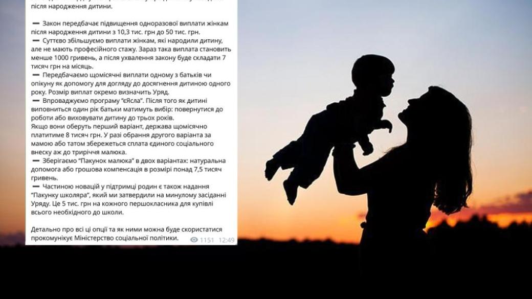 По его словам, каждая женщина после рождения ребенка одноразово получает 50 000 грн. Для беременных 7000 грн ежемесячно. Для одного из родителей или родственников, который ухаживает за ребенком 7000 грн ежемесячно.