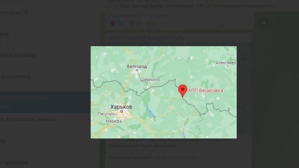 Российские Телеграмм-каналы со ссылкой на паблики российского города Белгород сообщают, что российские пограничники якобы отступили и бросили пограничный пункт Вериговка. На данный момент официального подтверждения данной информации нет.