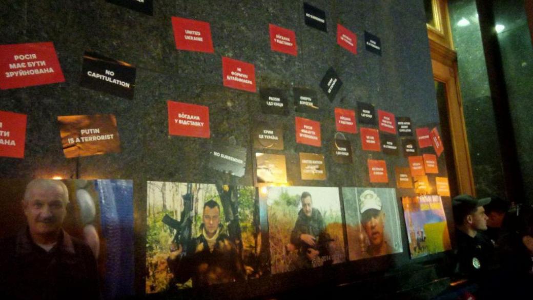 Так, участники акции наклеили на здание ОП наклейки на которых были надписи «Нет капитуляции», «Крым — это Украина», «Донбасс — это Украина», «Нет формуле Штайнмайера», «Богдана в отставку» и другие.