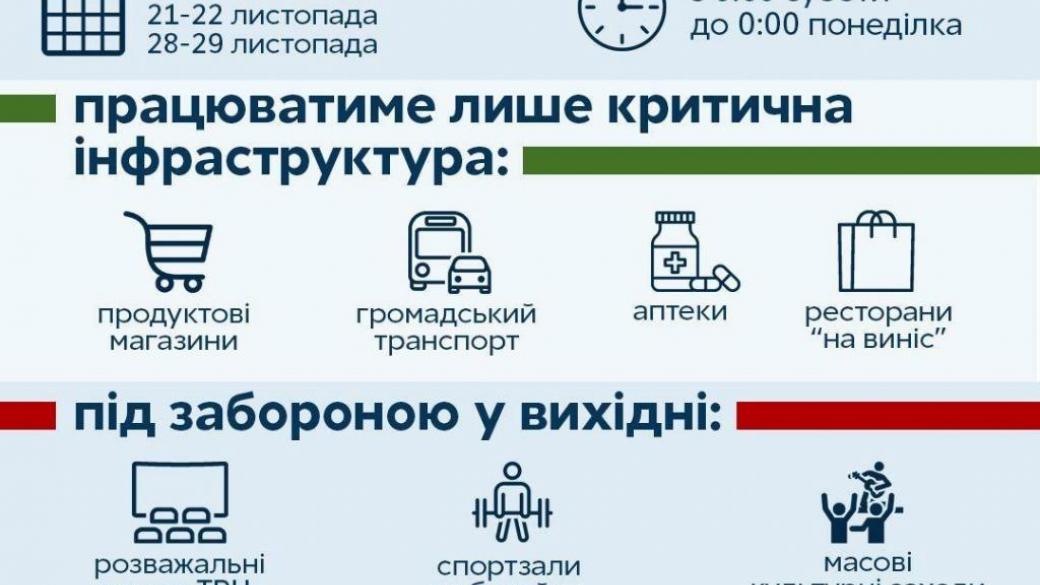 С 00:00 сегодняшней субботы, 14 ноября, в Украине начал действовать так называемый карантин выходного дня. Он продлится до 00:00 понедельника. Предварительно ограничения установили на три недели — с 14 ноября по 30 ноября 2020 года.