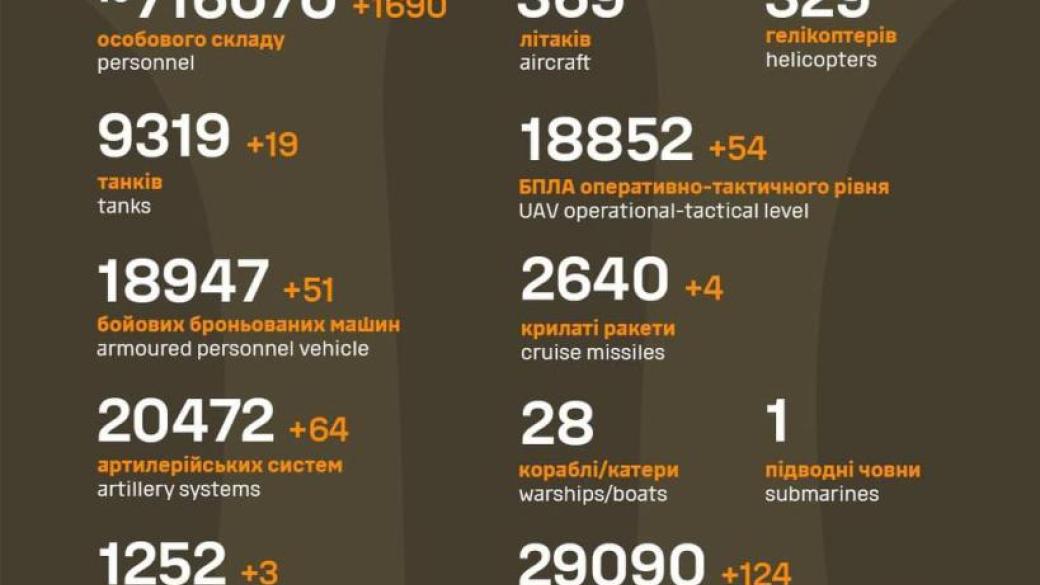 В течение прошедших суток ВСУ было ликвидировано 1 690 оккупантов и 320 единиц вражеской техники.