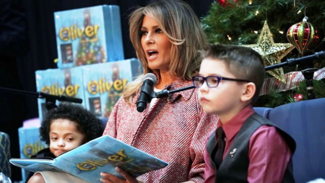 На встречу с детьми Мелания Трамп надела яркое пальто в мелкую красно-белую полоску от Tomas Maier, под которым было видно роскошное белое платье. Ее образ дополняли яркие туфли в тон верхней одежды от культового Manolo Blahnik. В ходе визита она пообщалась с маленькими пациентами и прочла детям несколько рождественских историй и подарила подарки.