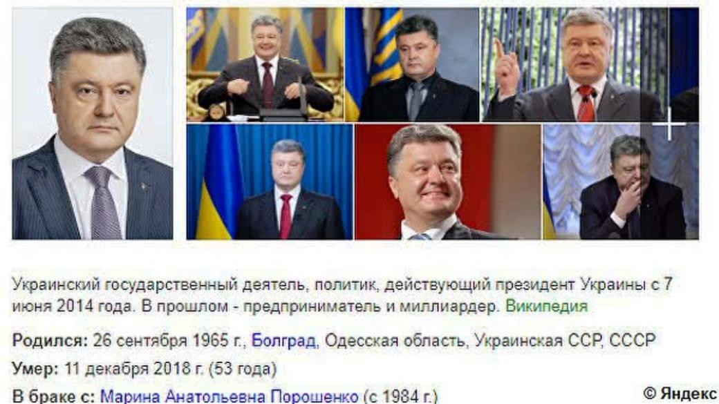 Российская поисковая система «Яндекс» сегодня неожиданно «похоронила» президента Украины Петра Порошенко. Так, Википедии поисковика сказано, что глава Украины умер 11 декабря в возрасте 53 лет.