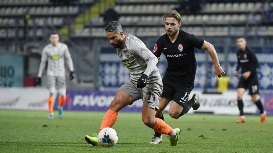 Первый матч игры в Запорожье обе команды сыграли на равных в борьбе за мяч, не желая уступать друг другу центр поля. Еще в начале первого тайма хозяева побеспокоили «горняков» двумя попытками забить гол, но к счастью донецкой команды, они оказалась не точными. За первые 45 минут счет так и не был открыт обеими командами.