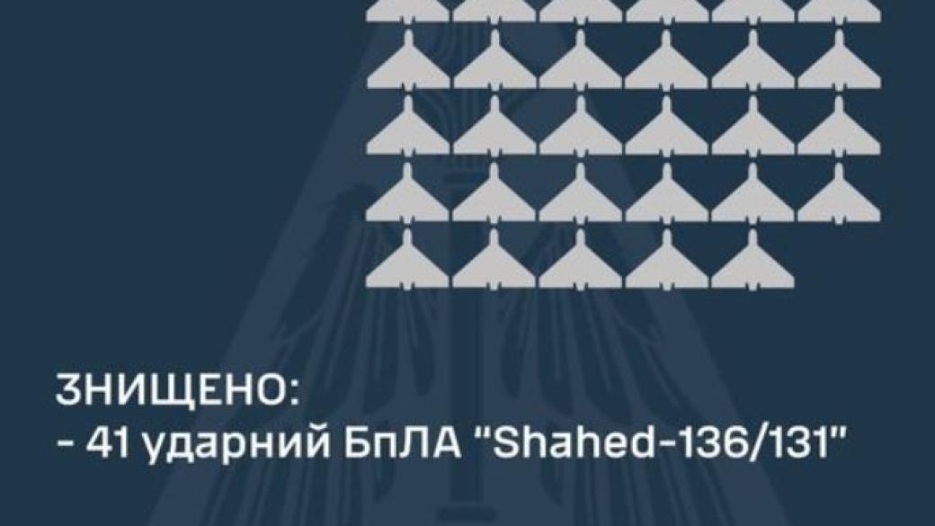 Этой ночью защитники неба сбили 41 из 42 ударных БпЛА типа «Shahed». Подавляющее большинство – в Одесской области.