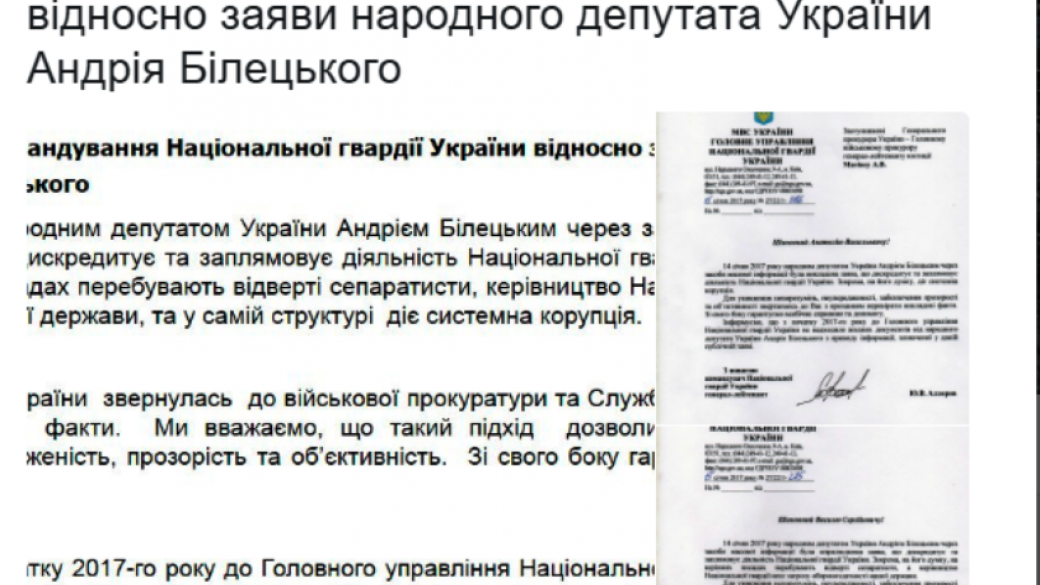В документе, опубликованном на странице Нацгвардии в соцсети указано: «14 января 2017 года народным депутатом Андреем Билецким через средства массовой информации было изложено заявление, что дискредитирует и клеймит деятельность Национальной гвардии. В частности, по его мнению, на руководящих должностях находятся откровенные сепаратисты, руководство Нацгвардии несет угрозу обороноспособности нашего государства, и в самой структуре действует системная коррупция».