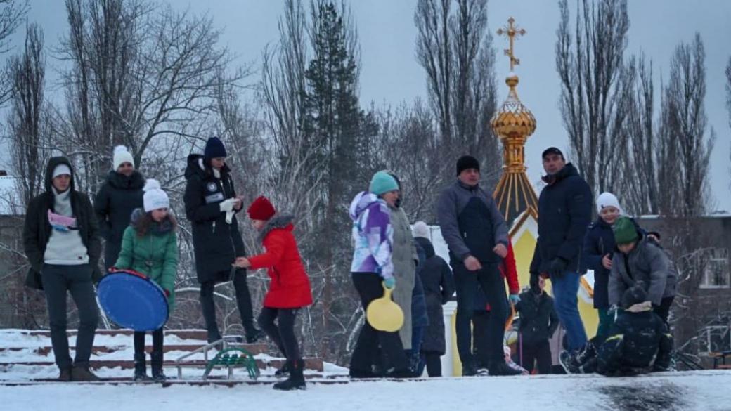 В неподконтрольной украинскому правительству Горловке сегодня вечером в сквере Героев был аншлаг. Родители после работы вели детей кататься на горку в центре города.
