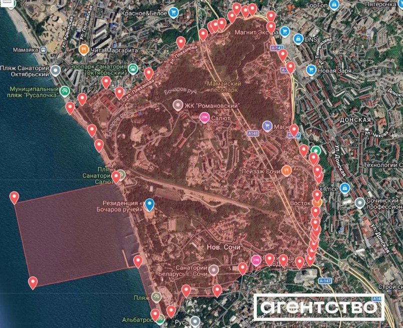 Охранные зоны, подобные вышеуказанной, хотят ввести еще на четырех участках в Сочи и на одном в Кисловодске, где расположена правительственная дача "Сосновый бор".