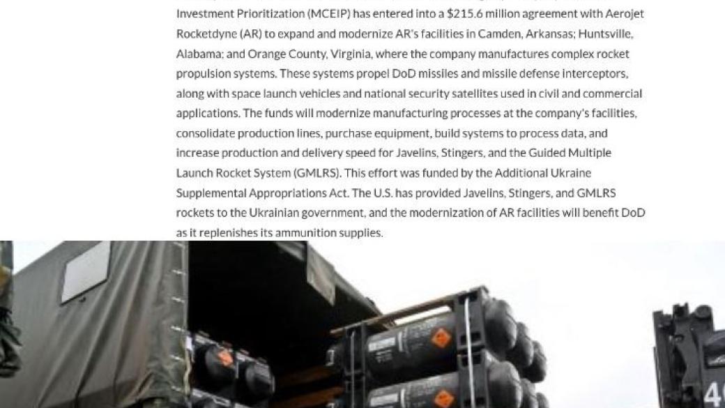 Согласно информации ведомства, эти средства пойдут на модернизацию производства на предприятиях Aerojet Rocketdyne, изготавливающих данное вооружение. Отмечается, что Пентагон хочет добиться увеличения скорости производства и поставок Javelin, Stinger и управляемых ракет GMLRS (для HIMARS).