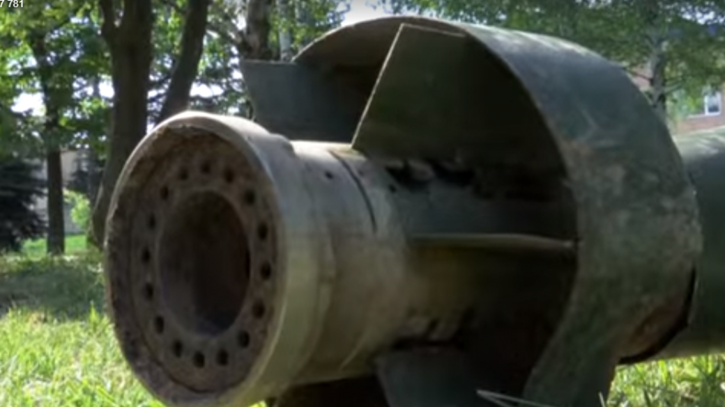 Волонтеры фонда «Вернись живым» отмечают: «Еще одно очередное доказательство российской агрессии на Донбассе. На видео ниже — ракета, ее изготовили боевики „ДНР“ из российских элементов — реактивных систем залпового огня „Град“ и „Смерч“, калибры которых составляют, соответственно, 122 и 300 мм. Снаряд прилетел на днях в населенный пункт Новолуганское и, к счастью, не разорвался».