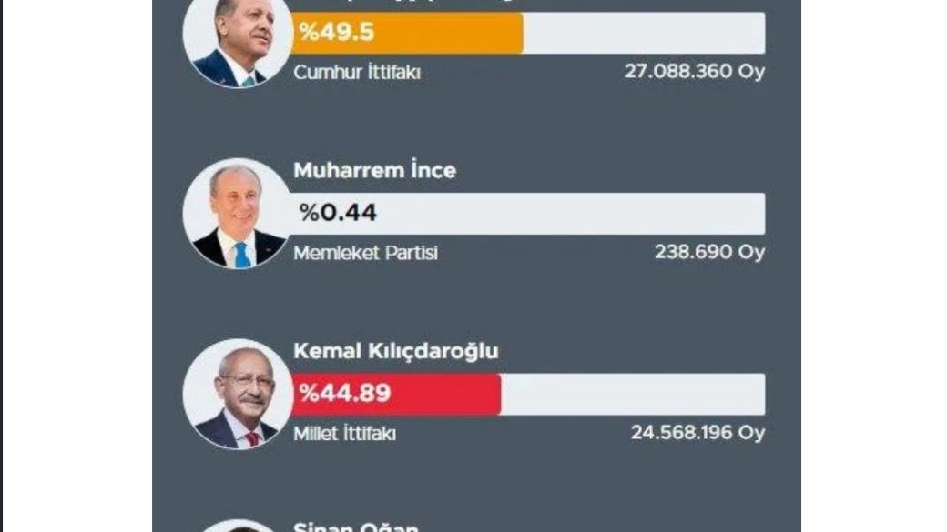 Также уточняется, что после вскрытия 100% урн для голосования у Эрдогана 49,5% голосов, а у Кылычдароглу - 44,89%.