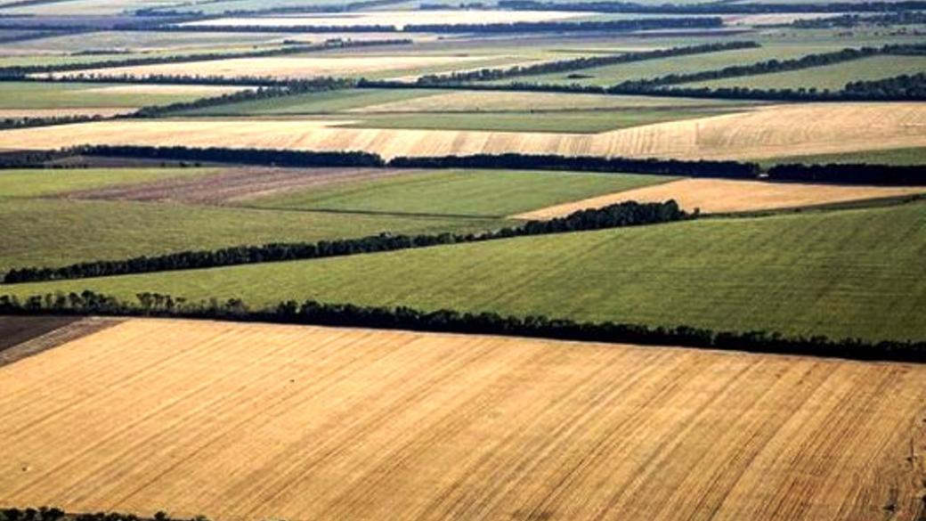 На фото показан пейзаж с засеянными полями и лесополосами, характерными для восточных территорий Украины.