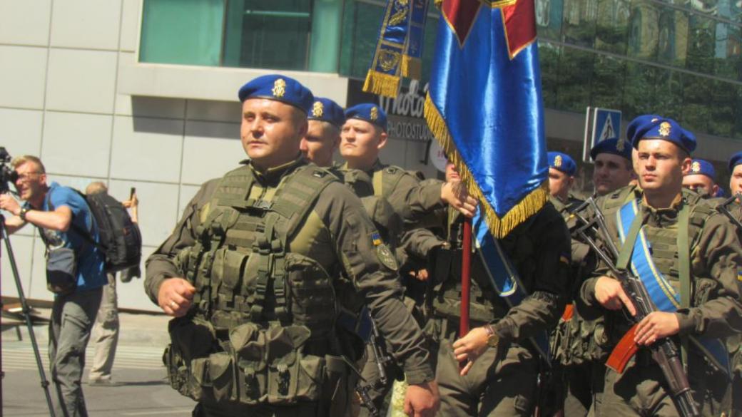 Военное шествие началось от Греческой площади. В параде приняли участие добровольцы батальона Азова, бойцы НГУ, пограничники, полицейские и курсанты ДЮИ.