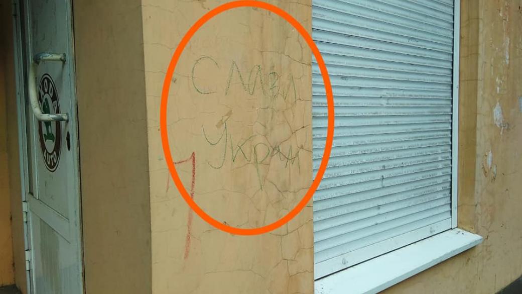 После этого фасад старого магазина, на котором была надпись «Слава Украине», испортили, закрасив надпись черной краской и дописав «Новороссия». Однако рядом появились еще одни слова «Слава Украине».