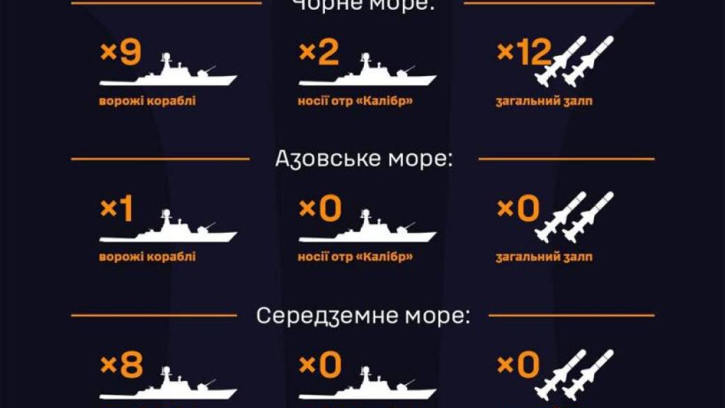 На данный момент в Азовском море находится один вражеский корабль; а в Средиземном море на боевом дежурстве находится до 8 вражеских кораблей.