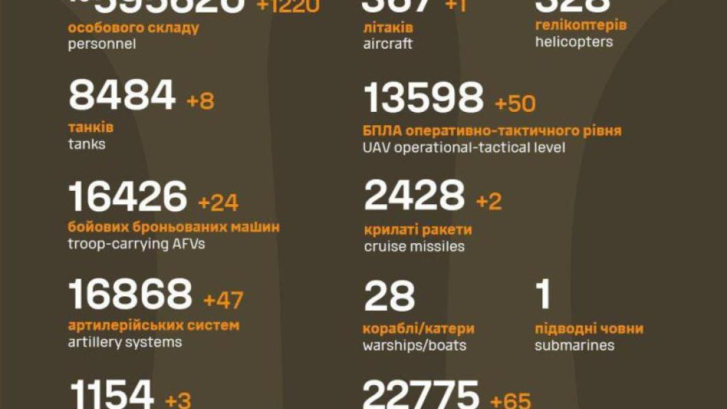 Силы обороны Украины за минувшие сутки ликвидировали 1220 российских захватчиков, 1 самолет и 200 единиц вражеской техники.