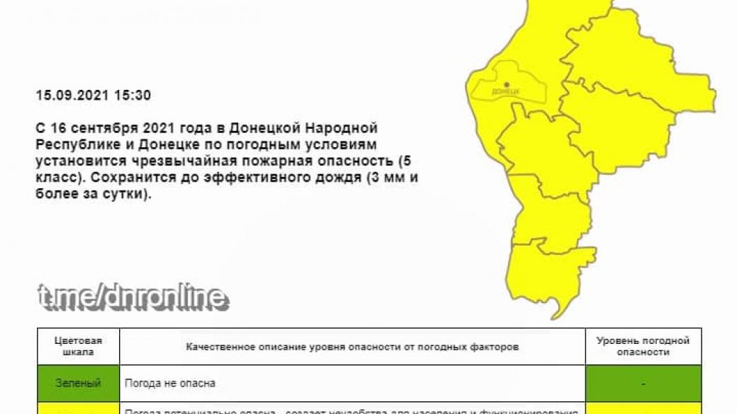 В так называемом «ведомстве» отметили, что с 16 сентября 2021 года в ОРДО по погодным условиям установится чрезвычайная пожарная опасность (5 класс). Сохранится до эффективного дождя (3 мм и более за сутки).