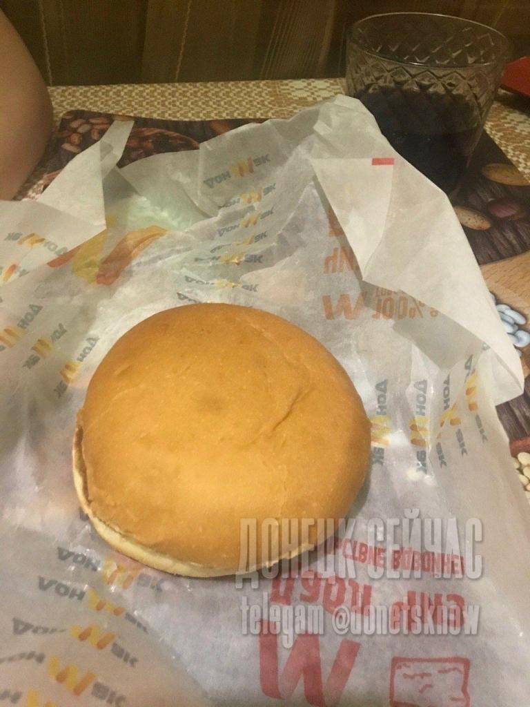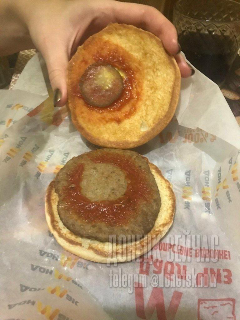 Жители временно неподконтрольных украинскому правительству территорий Донецкой области показали, какие «гамбургеры» подают в местном кафе «ДонМак», которое заняло площади исчезнувшего из Донецка MC`Donalds.